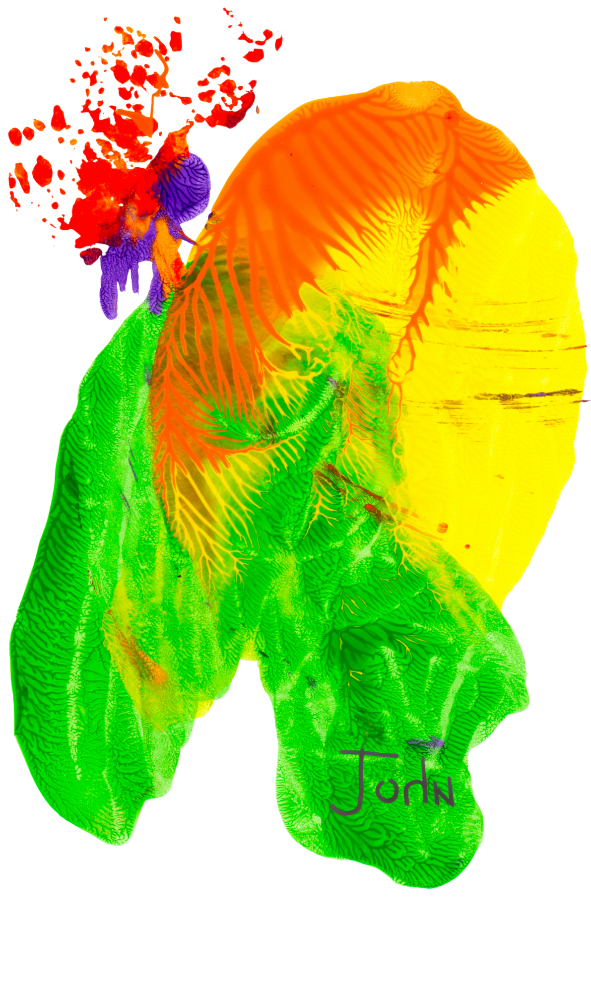 John is 5 years old from the New South Wales Coast. He loves using leaves and sticks to apply his acrylics to paper, cardboard or what ever is available (except the walls inside the house) John enjoys bright vibrant colours and believes "The brighter, the better" John's work is available for commission and also on his signature line of T-shirt. When John grows up he wants to paint pictures on the sides of buses. "But only if the bus driver says its ok" -John